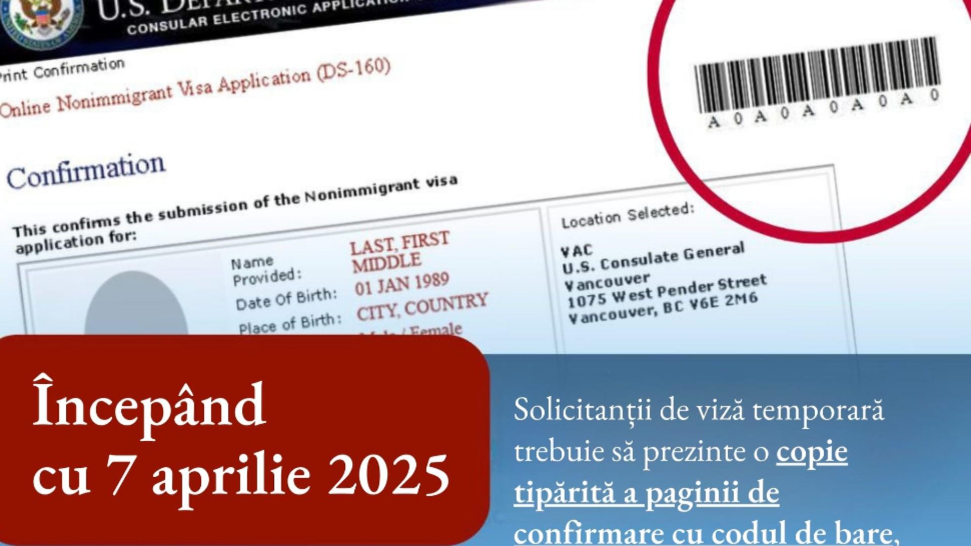 „Începând cu 7 aprilie 2025, toți solicitanții de viză temporară trebuie să prezinte o copie tipărită a paginii de confirmare cu codul de bare, pentru a demonstra că au utilizat același formular de cerere DS-160 pentru a-și programa interviul”, se arată într-un comunicat de miercuri al Ambasadei.