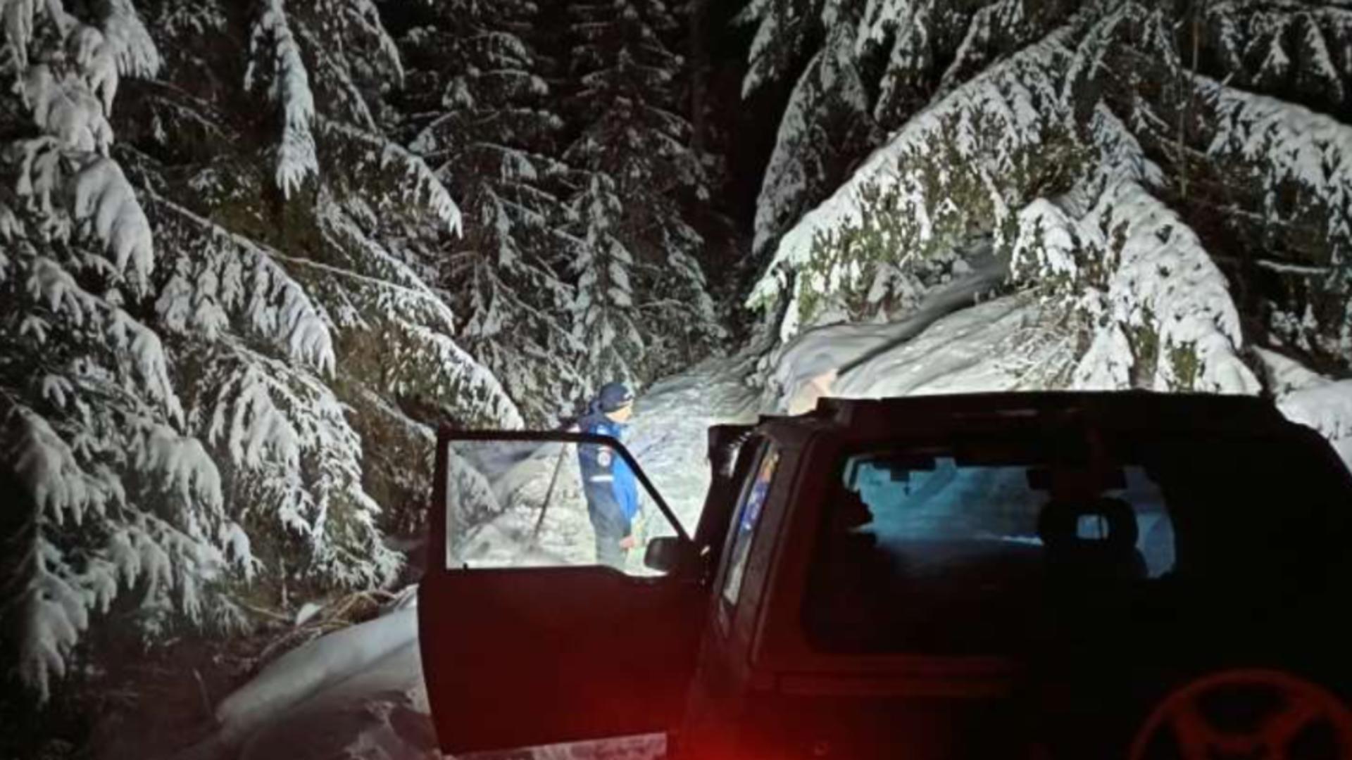 Două persoane rămase înzăpezite cu autoturismul pe un drum forestier din Apuseni, salvate de jandarmi. Intervenție în condiții de vreme nefavorabilă