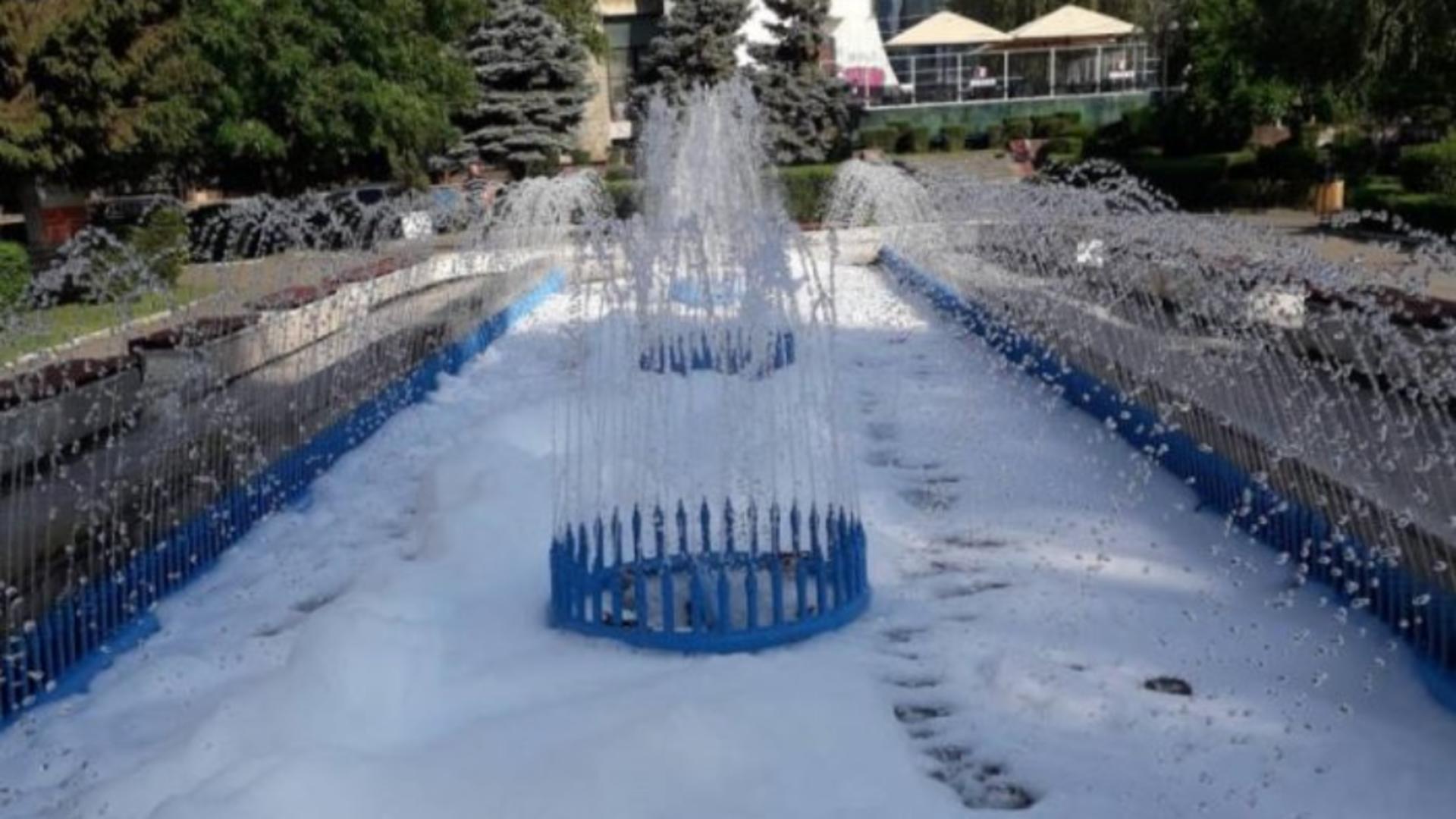 Autorii necunoscuți încă de forțele de ordine au turnat o substanţă care produce spumă în apa unei fântânii din apropierea sediului Primăriei.
