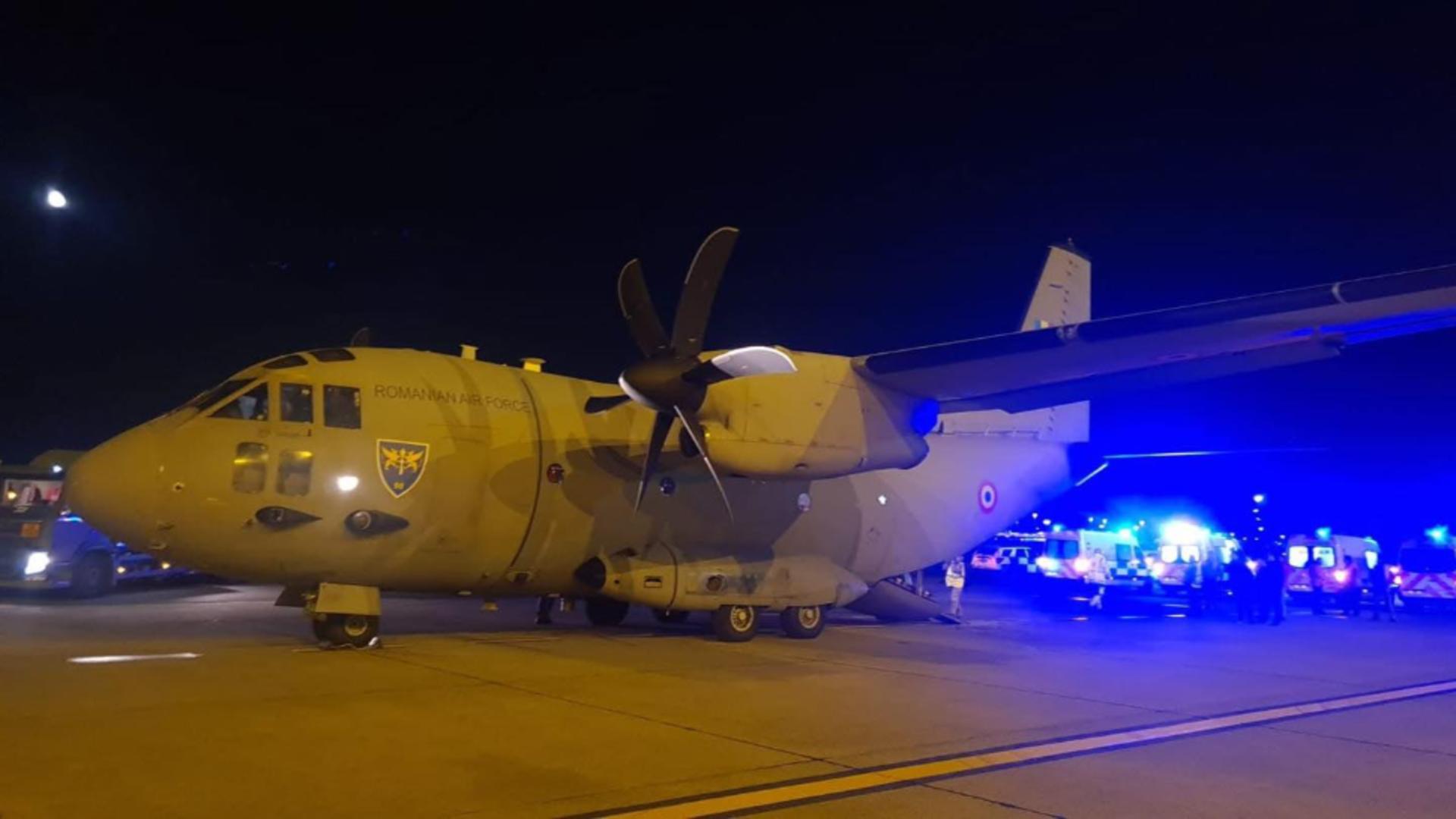 În total, în România au fost aduşi din Israel, în cursul serii de miercuri, 13 pacienţi şi 34 de membri de familie, cu o aeronavă C 130 Hercules a Ministerului Apărării Naţionale.