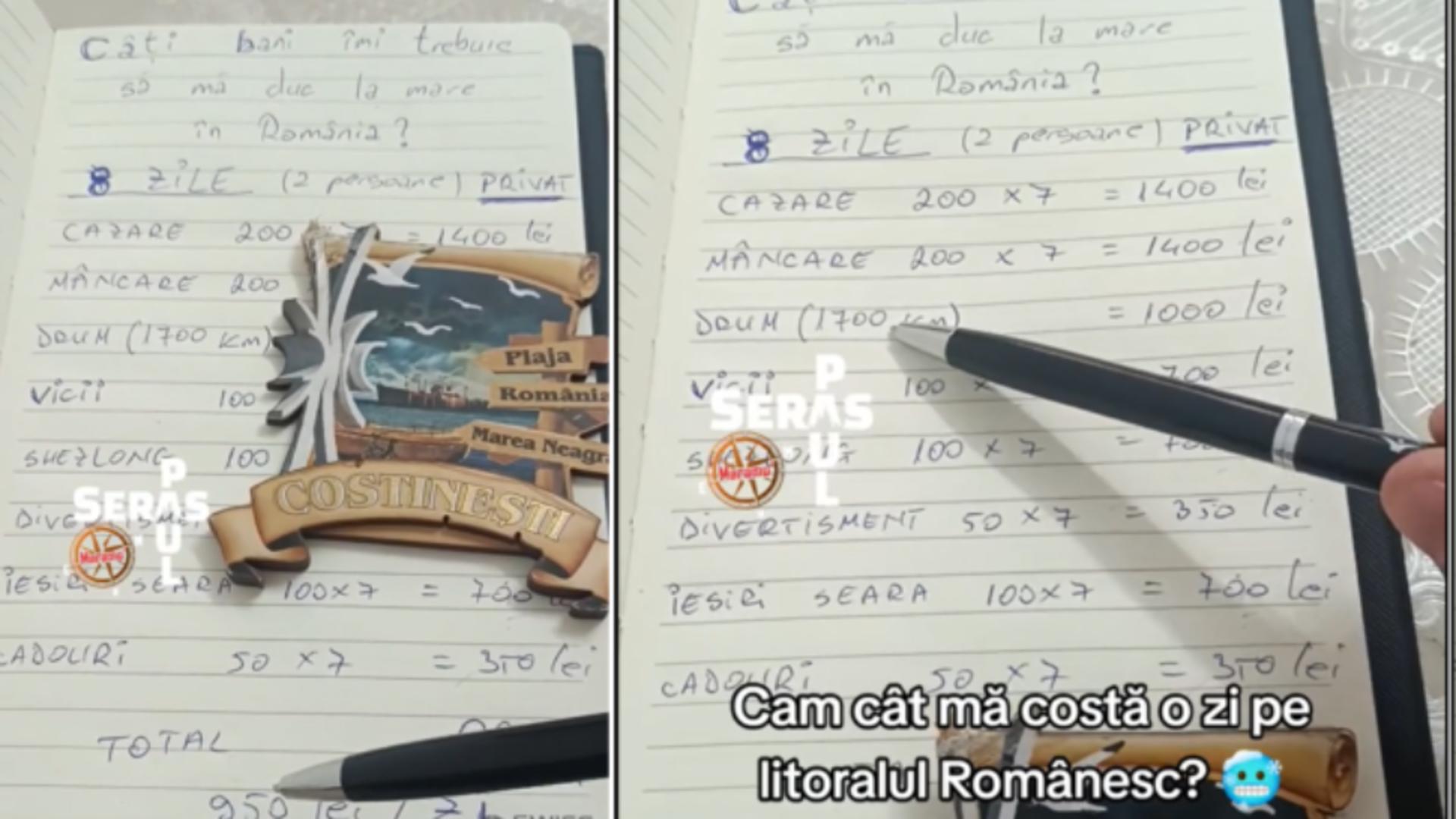 “Hai să vedem câți bani îmi trebuie să mă duc la mare în România în 2024. 8 zile, 7 nopți, 2 persoane la privat, nu la hotel, nu la all inclusive. Eu am zis așa: cazare, 200 lei pe noapte, 1400 lei pe concediu.