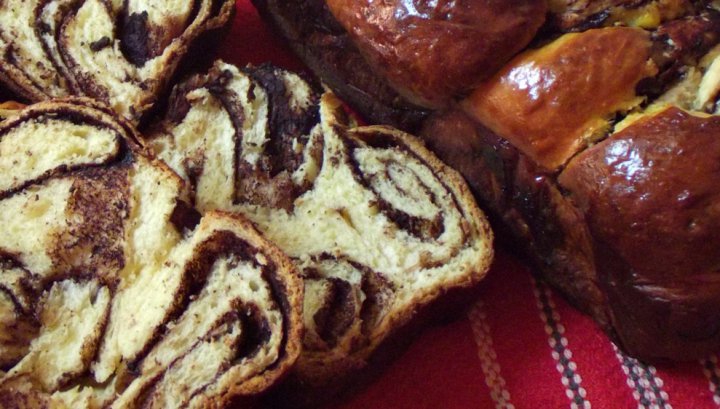 Întoarce-te la aluat o oră mai târziu, minunându-te de ce mare s-a făcut, împarte-l în două şi întinde-l cu destoinicie. Adaugă umplutura – cacaua, stafidele aromate, deliciosul rahat şi nuca crocantă, împleteşte şi aşază în două tăvi. Pune ltăvile în cuptor, la temperatură medie, timp de 50-60 de minute. Este momentul să răsufli uşurată, tocmai ai dat naştere unei mici minuni, iar casa ta miroase a Crăciun.