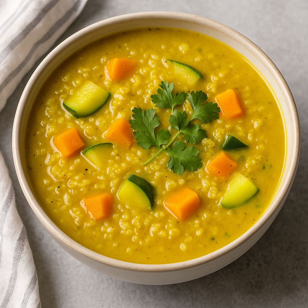 Această supă cremă este o sursă excelentă de fibre și vitamine datorită legumelor și quinoa-ului, iar turmericul adaugă nu doar o culoare frumoasă, ci și proprietăți antiinflamatorii și antioxidante.
